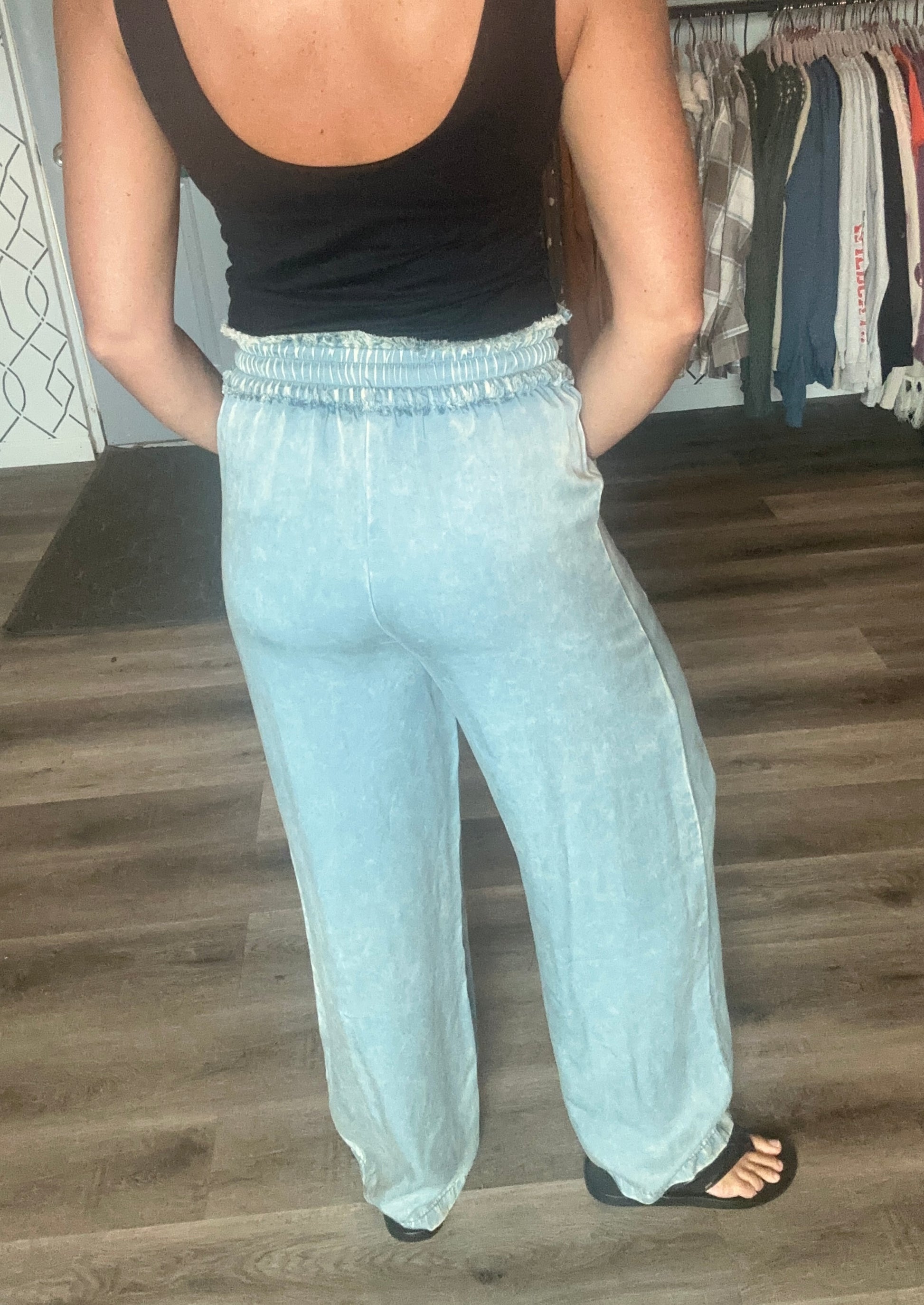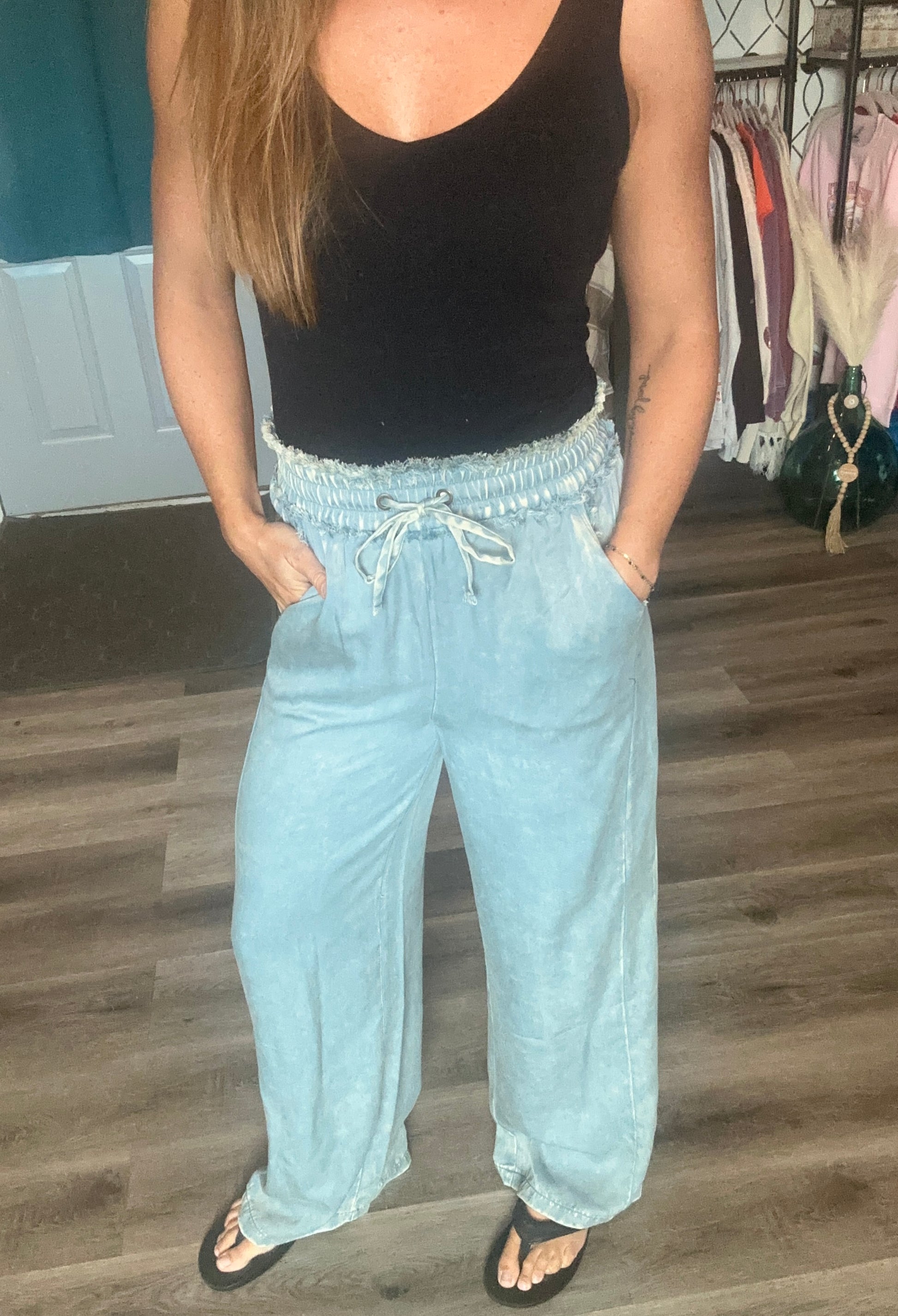 "The Layla Tencel pants in blue grey are the perfect combination of style and comfort. The washed tencel fabric is incredibly soft and the drawstring and pockets add functionality. The fray detail adds a touch of unique style to these versatile pants."
